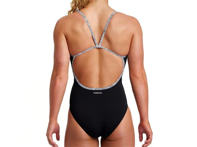 Der Funkita Badeanzug für Frauen mit einfachem V-förmigen Träger und freiem Rücken im Black Current Design. Schnitt und formgebende Nähte sorgen für den perfekten Sitz während des Schwimmens. Der Badeanzug hat nur vorne eine leichte Fütterung in Form einer zweiten Stoffbahn (Inner Lining) und das kleinem Funkita Logo auf der Rückseite. Hergestellt aus Funkitas exklusiven C-Infinity-Gewebe, einem 100% italienischen Polyester, das einen farbenfrohen Durchbruch in der chlorresistenten Gewebetechnologie darstellt! C-Infinity ist die erste Wahl für Schwimmer und hat eine außergewöhnliche Festigkeit und kann seine Haltbarkeit weit über andere Elastan-Bademodenstoffe hinaus beibehalten. Ideal für die häufige Nutzung im Schwimmbad für Freizeit- und Leistungsschwimmen.