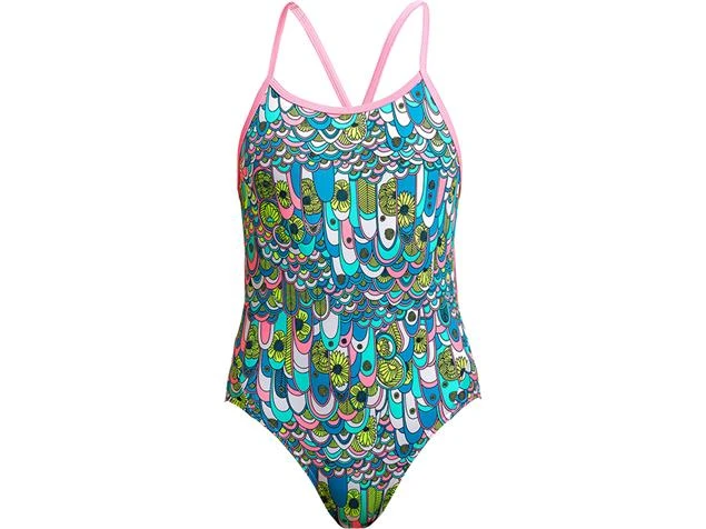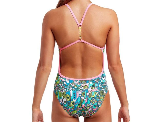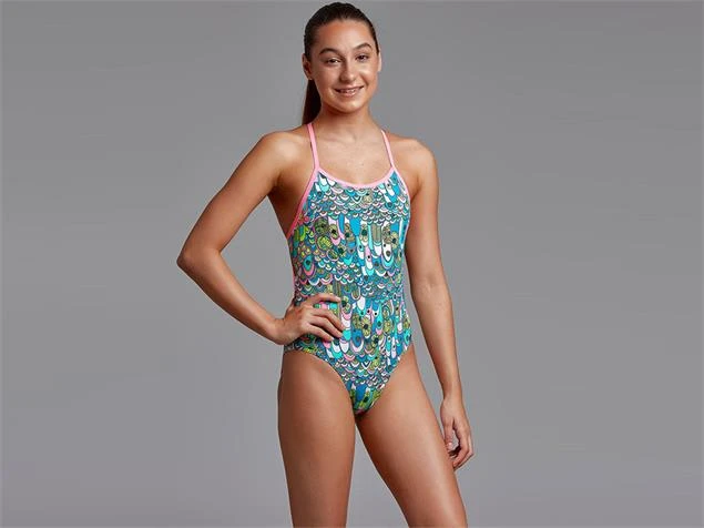 Der Twisted One Piece Mädchen Badeanzug von Funkita bietet dir bei deinem Training absolute Bewegungsfreiheit. Die Träger laufen raffiniert im Rücken zusammen, und sind dort getwisted (gedreht), dies sieht nicht nur hübsch aus, es minimiert auch die Reibung beim Schwimmen. Der Badeanzug hat einen hohen Beinausschnitt und Cut-Aways an den Seiten. Damit er auch an den wichtigen Stellen blickdicht ist, ist er von Innen im vorderen Bereich gefüttert.