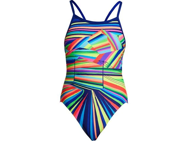 Der Funkita Badeanzug für Mädchen und Jugendliche mit einfachem V-förmigen Träger und freiem Rücken im Land Lines Design. Schnitt und formgebende Nähte sorgen für den perfekten Sitz während des Schwimmens. Der Badeanzug hat nur vorne eine leichte Fütterung in Form einer zweiten Stoffbahn (Inner Lining) und das kleinem Funkita Logo auf der Rückseite. Hergestellt aus Funkitas exklusiven C-Infinity-Gewebe, einem 100% italienischen Polyester, das einen farbenfrohen Durchbruch in der chlorresistenten Gewebetechnologie darstellt! C-Infinity ist die erste Wahl für Schwimmer und hat eine außergewöhnliche Festigkeit und kann seine Haltbarkeit weit über andere Elastan-Bademodenstoffe hinaus beibehalten. Ideal für die häufige Nutzung im Schwimmbad für Freizeit- und Leistungsschwimmen.