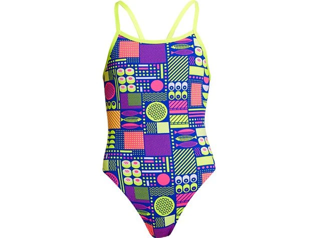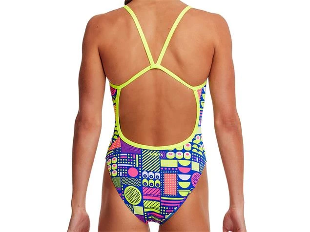 Der Funkita Badeanzug für Mädchen und Jugendliche mit einfachem V-förmigen Träger und freiem Rücken im Packed Lunch Design. Schnitt und formgebende Nähte sorgen für den perfekten Sitz während des Schwimmens. Der Badeanzug hat nur vorne eine leichte Fütterung in Form einer zweiten Stoffbahn (Inner Lining) und das kleinem Funkita Logo auf der Rückseite.