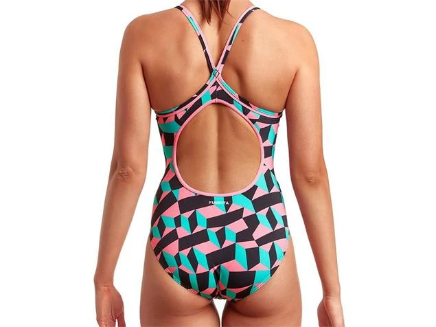 Der Funkita Badeanzug für Damen mit Diamond Back Rückenausschnitt im Step Up Design. Mit diesem Badeanzug sind Sie der Hinkucker am Pool! Die schmalen Träger sind im Rücken über Kreuz gebunden für einen optimalen Kompfort des großen Rückenausschnitts mit moderat hohem Beinausschnitt. Hergestellt in C-Infinity Qualität, einem Farbintensiv, chlorbeständigem Polyestermaterial exklusiv von Funkita und Funky Trunks.