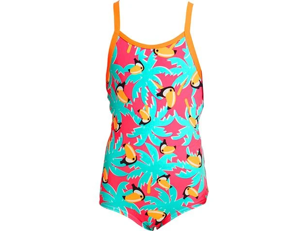 Der Funkita Toddler Badeanzug für Mädchen mit geschlossenem Rücken im Toucan Tango Design. Die „Single Strap“ Träger und der Rückenschnitt im Racer Back Stil machen ihn perfekt für viele Schwimmausflüge in einem bequemen Badeanzug. Der Toddler Badeanzug hat vorne ein Inner Lining, wodurch der Tragekomfort nochmals erhöht wird