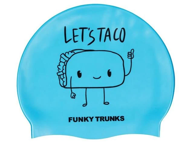Die weiße Badekappe im Let’s Taco Design mit süßem Koala von Funky Trunks besteht zu 100% aus Silikon.