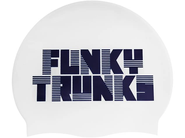 Die weiße Badekappe im Space Cadet Design von Funky Trunks besteht zu 100% aus Silikon.
