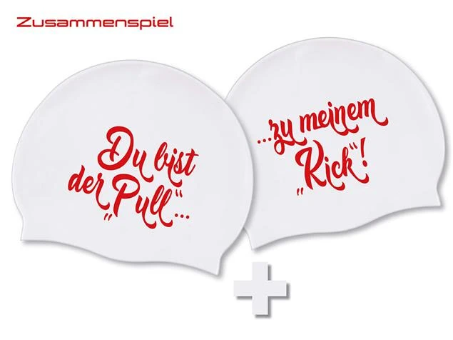 Das Set für Verliebte: Zwei Badekappen mit Partner Slogan!